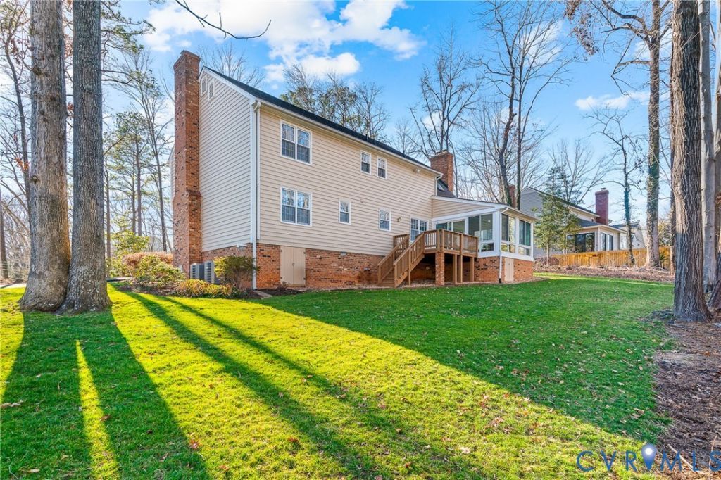 Tucked at the end of a quiet cul-de-sac in one of Chesterfield's most sought-after neighborhoods, this meticulously maintained Stonehenge home offers timeless space and everyday comfort with the added benefit of the neighborhood's golf course and country club just moments away. A generous foyer welcomes you into classic formal living and dining rooms, with the living room flowing seamlessly into a rear office-ideal for today's work-from-home lifestyle. The warm, inviting den with fireplace opens to a bright sunroom overlooking a wooded backyard with seasonal golf course views, creating a peaceful setting for relaxing or entertaining. Hardwood floors extend throughout the first and second levels, including four generously sized upstairs bedrooms. The spacious primary suite features a walk-in closet and a flexible adjoining room perfect for a nursery, office, or future expansion for a larger bath or closet renovation. Additional highlights include granite kitchen countertops, quartz counters in the upstairs baths, three fireplaces, newer HVAC systems, a newer water heater, and a wired alarm system tied into the smoke detectors. The EV-ready garage connects to a versatile flex space suitable for an office, home gym, workshop, home business, or potential one-level in-law suite. A walk-up attic provides abundant storage and future potential and the tall crawlspace features a concrete pad for additional yard equipment/tool storage. All just minutes from award-winning schools, Wegmans, Sam's Club, and the Village of Midlothian's shops and restaurants.