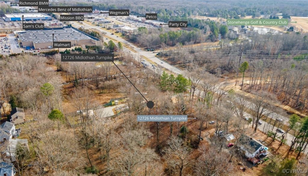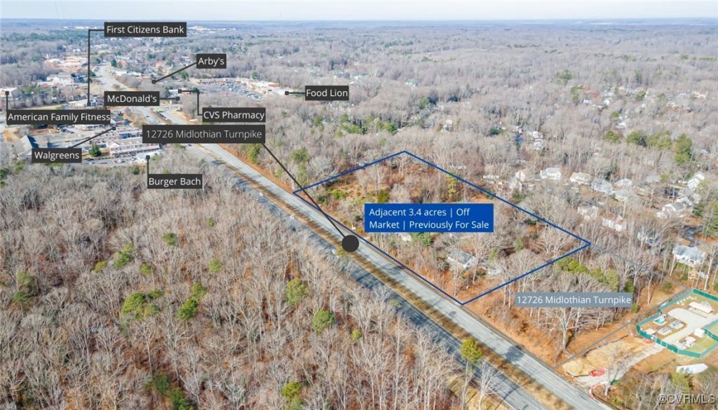 Welcome to 12726 Midlothian Turnpike which is conveniently nestled in a prime area of the Greater Richmond MSA undergoing an impressive development trend. This 1.41 acres enjoys Midlothian Turnpike frontage with an ADT of 39,000 and is perfect for any use in need of a high ADT with evening commuter targeting. The adjacent 3.4 acre parcels were previously for sale and may be available to increase overall development acreage, however those parcels are no longer on the market at this time. Close to Walton Park, Salisbury, The Grove and other major residential areas; retail giants like Walmart, Food Lion, American Family Fitness, Wegman's, Petco, Party City, Walgreens, CVS and Sam's Club have enjoyed long term success in the area with other small retailers joining the fray. The site would be perfect for a self-storage facility, medical office, retail use, owner-user freestanding commercial or even multi-family (with adjoining parcels). This land is located in a prime rental rate area which can produce higher than expected returns post development. Currently priced to move, this 1.41 acres now favors developer entry into the area with primary road frontage needs. There is currently a 1 inch water line to the property, which may need to be expanded. Sewer line is located behind the property and a potential easement with the neighboring partner may be required. County will not allow septic at this area, but has offered incentives to expand the water line across Route 60.