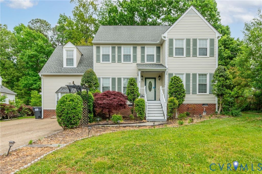 Tucked away on a quiet cul-de-sac in Henrico's desirable West End, this spacious and beautifully maintained home offers timeless curb appeal, flexible living spaces, and a peaceful setting surrounded by mature landscaping. A charming front entry welcomes you inside, where fresh neutral paint and checkerboard tile floors create an inviting first impression. The main level features a generous formal living room or home office, along with an expansive family room designed for gathering and everyday living. Hardwood floors, crown molding, recessed lighting, elegant columns, and a classic brick fireplace add warmth and character, while French doors open seamlessly to the rear deck for easy indoor-outdoor entertaining. The bright eat-in kitchen offers abundant cabinetry, a center peninsula for prep and seating, stainless steel appliances, and a sunny breakfast nook wrapped in windows overlooking the private backyard. A separate dining room provides the perfect space for holiday meals, dinner parties, or everyday celebrations. Upstairs, the spacious primary suite is a true retreat with vaulted ceilings, abundant natural light, and room for a sitting area or workspace. Three additional bedrooms are generously sized and offer flexibility for guests, hobbies, or work-from-home needs. The finished garage adds even more versatility, ideal for a recreation room, gym, playroom, or media area. Step outside to enjoy the oversized rear deck surrounded by mature trees and lush landscaping, creating a private outdoor escape perfect for morning coffee or summer entertaining. Just minutes from Short Pump shopping, dining, parks, and top-rated Henrico County schools, this West End gem combines comfort, space, and convenience in one exceptional package.