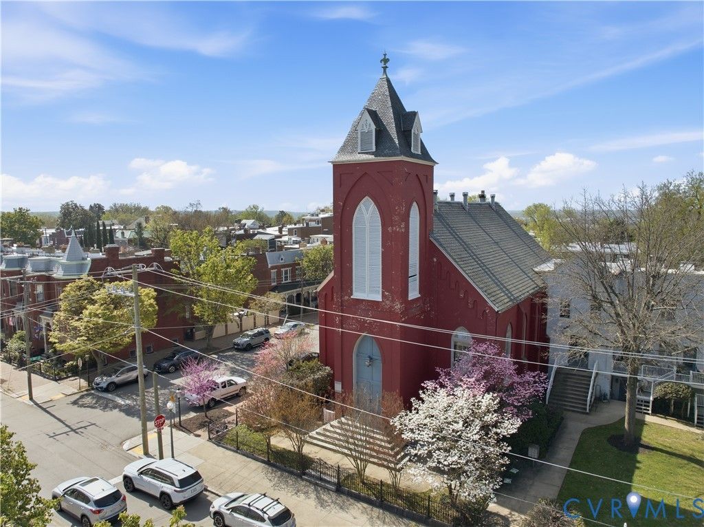 Welcome to 2511 E. Broad Street at The Belfry, a rare opportunity to own a piece of Richmond's architectural history. Set within a 19th-century Gothic Revival church, this light-filled, three-level condo offers a striking blend of preserved character & modern updates. A truly unique experience, this unit includes a private porch within the original steeple, creating a one-of-a-kind setting unlike anything else in the city. Defined by soaring 30+ ft ceilings & dramatic 20-ft Gothic windows, the space is filled w/ natural light, highlighting original heart pine floors & historic detail. The main level incorporates a portion of the original church balcony, showcasing wooden arches crafted w/ hand-forged nails dating to the late 1800s, a level of craftsmanship rarely seen today. Notable updates include 2022 fully renovated kitchen, whole unit fresh interior paint and window treatments, 2026 painted steeple porch, 2017 New electrical panel & HVAC, & restored (2014) windows w/ custom internal storm inserts for energy efficiency & UV protection. Custom lighting, curated finishes & thoughtful upgrades enhance the space while preserving its integrity. Through the double-door foyer, the main level features a spacious living room w/ wood-burning fireplace, dining area & open galley kitchen framed by a sweeping arch. The updated kitchen offers quartz countertops, SS appliances, shaker cabinetry & modern stacked tile backsplash. A Walk in pantry and mechanical room is also accessible. Upstairs, the layout unfolds across multiple levels, offering flexible living w/ office space, primary bedroom & access to the open-air steeple retreat. Perfectly positioned in the heart of Church Hill, just moments from neighborhood favorites, your morning coffee, evening walks & some of Richmond's best dining are right outside your door. Off-street parking & dedicated basement storage included. Minutes to VCU/MCV, I-95 & I-64 - Historic & unmistakably unique, The Belfry is a living experience you won't find anywhere else.