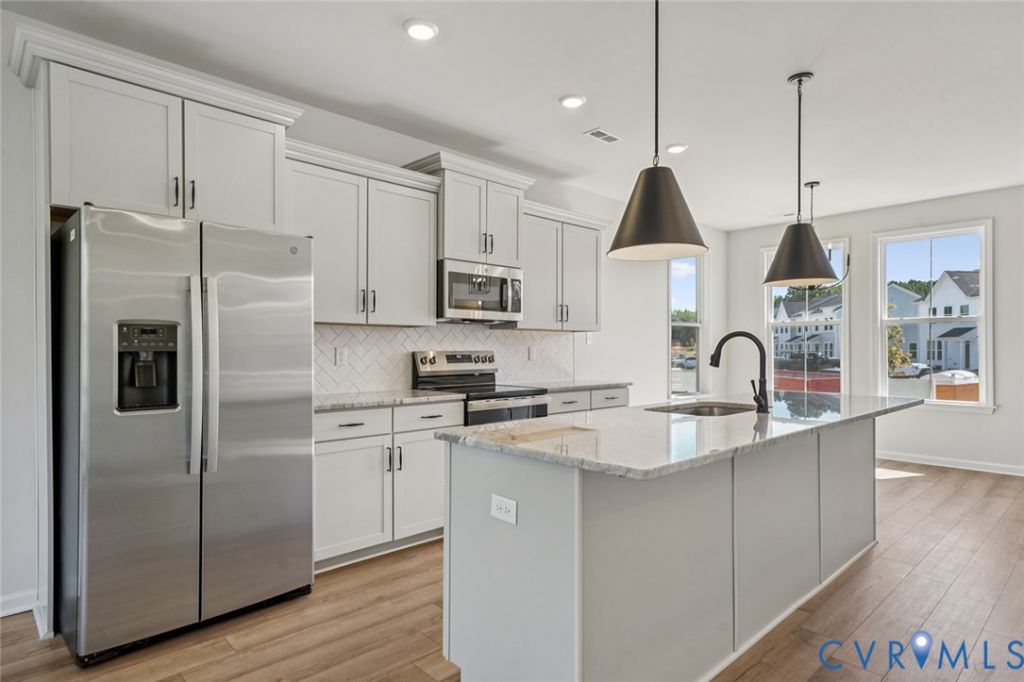 *MOVE IN READY*The Daphne is a beautifully designed three-story townhome that combines style, space, and functionality perfectly. This elegant end-unit home features four bedrooms and three and a half well-appointed bathrooms, creating an ideal living environment for modern homeowners. The striking Glacier White siding, complemented by Bessmer Gray brick accents, a bold black front door, and a durable charcoal roof, makes an unforgettable first impression. The second floor is the heart of the home, where the expansive family room seamlessly connects to the stylish eat-in kitchen. The chef's kitchen boasts River Blue granite countertops, sleek Frost full-overlay cabinets, a crisp white glossy backsplash, and striking black hardware. A black faucet and bold black pendant lights over the island add a sophisticated touch, while premium stainless steel Frigidaire appliances complete this modern culinary space. The lower level offers versatility and convenience, featuring a large bonus room with LVP flooring, a guest bedroom, a full bath, and additional storage space. The third level is dedicated to comfort, with a serene primary suite that boasts a spacious walk-in closet and a spa-like ensuite bath. The primary bathroom is a luxurious retreat with Blanco Maple quartz countertops, brushed nickel hardware, Fair ceramic tile flooring and shower walls, and a sleek nickel vanity light. Two additional bedrooms, a stylish hall bath with matching finishes, and an upstairs laundry-complete with an included washer and dryer. Additional upscale interior features include craftsman open rails with metal spindles, wood stairs leading from the main to the upper level, a complete ceiling fan in the primary bedroom, and a black-finish entry light for a polished look. Nestled in the vibrant McCauley Park community, residents enjoy access to top-tier amenities and a prime location. The Daphne isn't just a home-it's an elevated lifestyle. *Photos of the actual home*